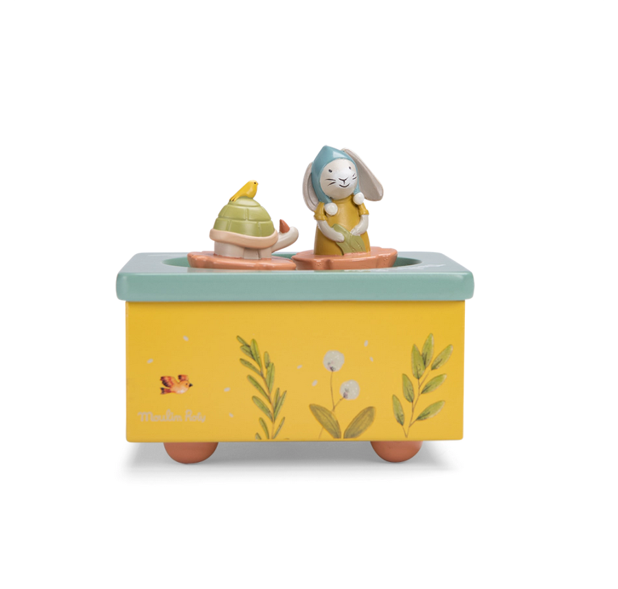 Carillon musicale illustrato con un allegro paesaggio di piante, verdure e uccellini del giardino. Il coniglio e la tartaruga girano e danzano sulla pista per cullare il bambino.