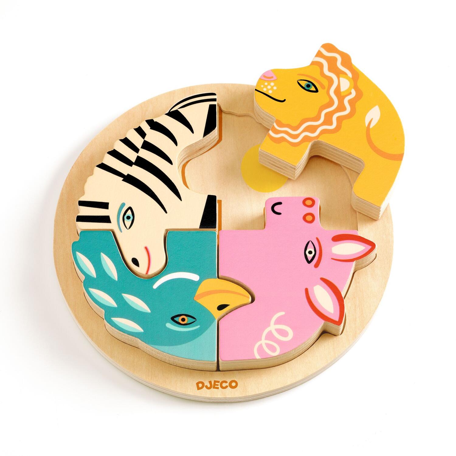 Rondo Leo è un puzzle di legno facile da assemblare sul tema degli animali. I quattro animali formano un cerchio e il bambino o la bambina li posiziona seguendo il contorno esterno e i tratti a terra, sviluppando così la percezione delle forme e la coordinazione.