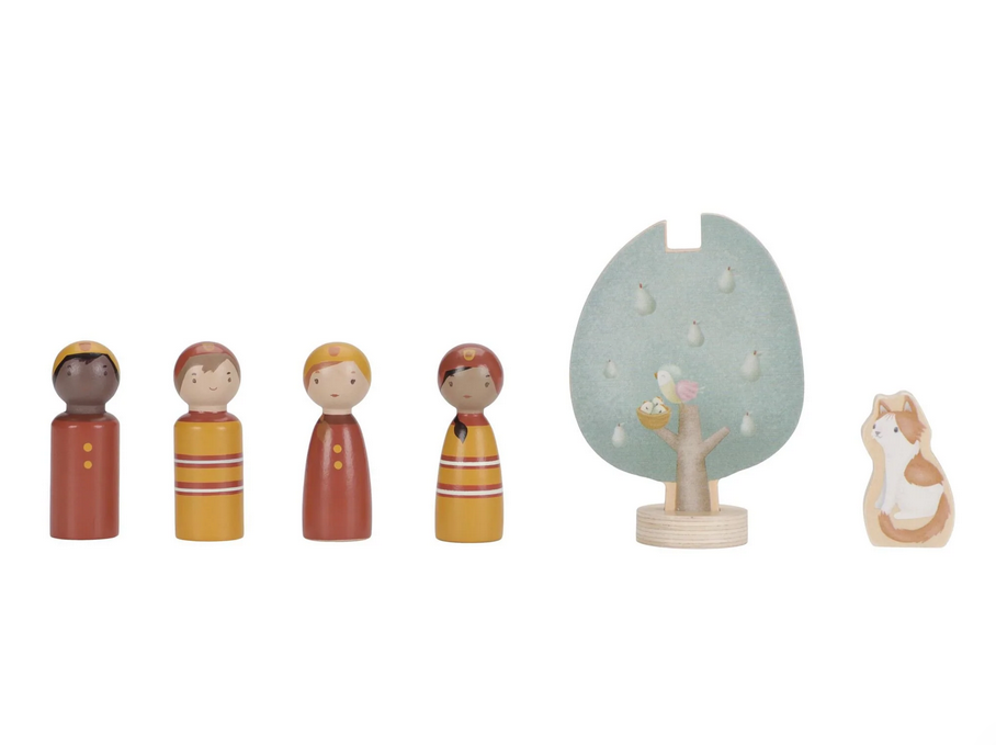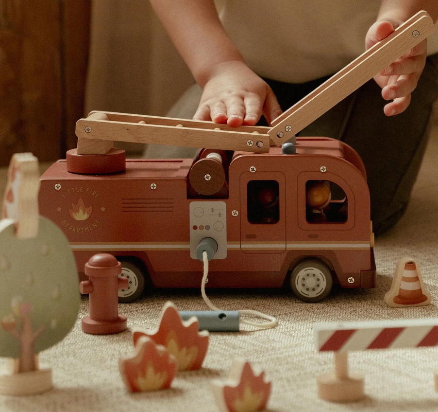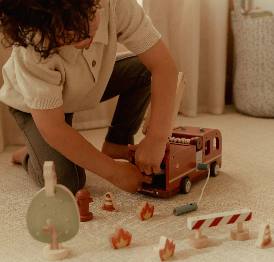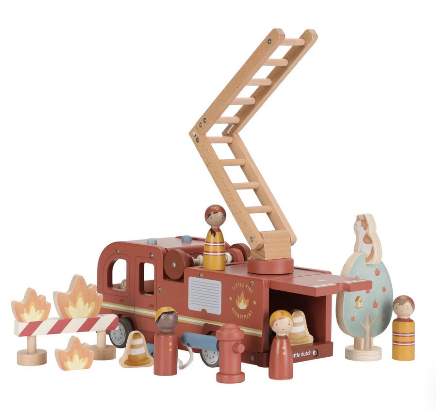 Salva il gatto dall'albero! Questo camion dei pompieri in legno è dotato di una scala estensibile e di una manichetta staccabile che puoi collegare all'idrante o al camion dei pompieri. Include quattro pompieri, fiamme e un idrante. Perfetto da abbinare ai giochi in legno Little Dutch!