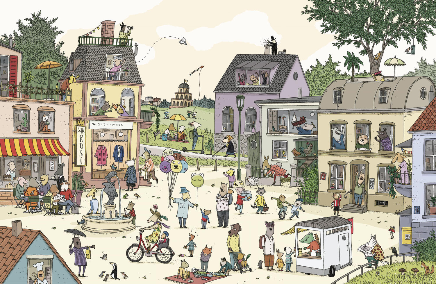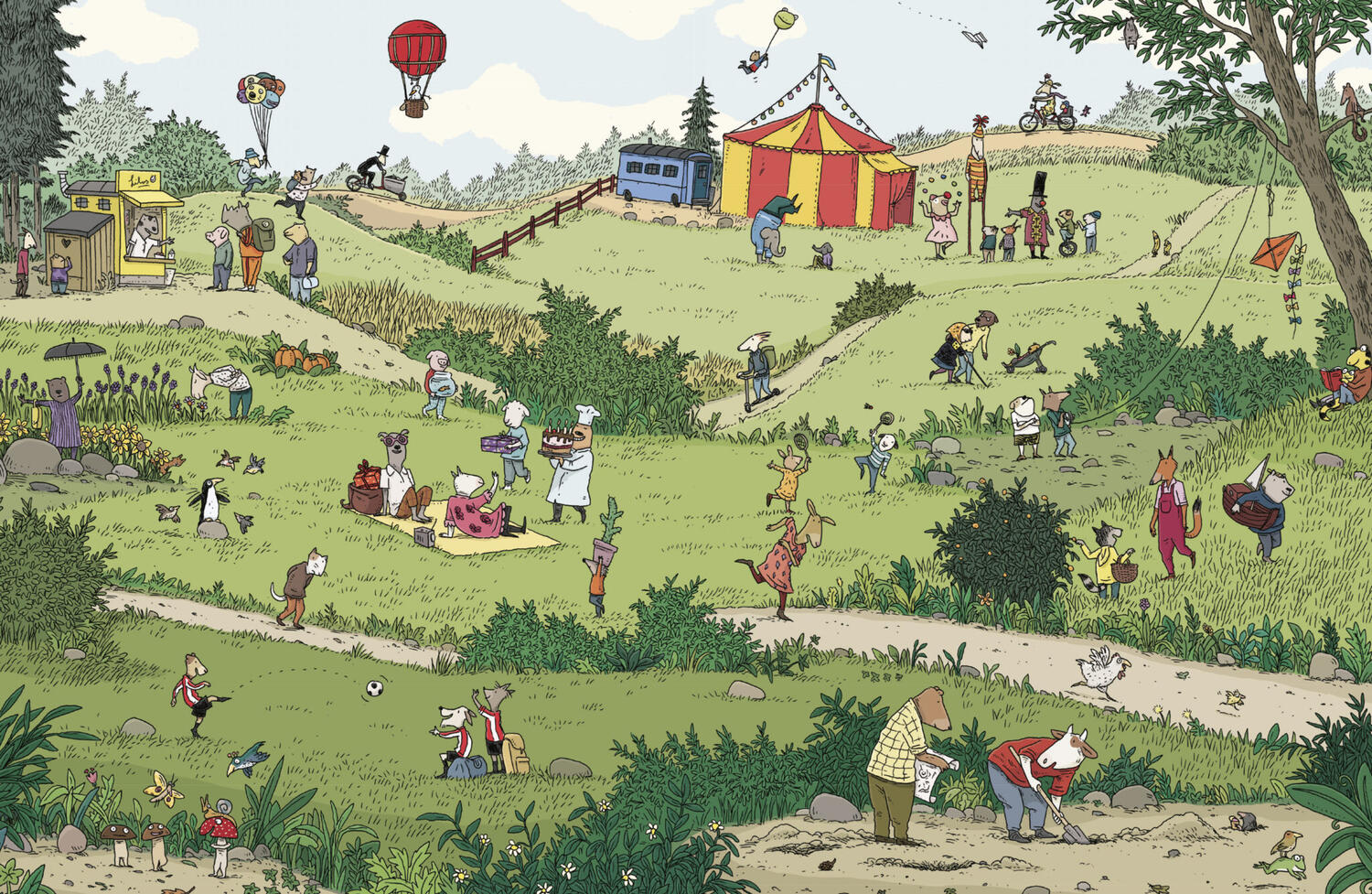 Nelle pagine di questo libro è racchiusa una giornata piena di momenti emozionanti: il calciatore troverà abbastanza amici con cui giocare? Chi sta inseguendo la gallina, e perché? Quale tesoro stanno cercando l’orso e il bue? E il maialino dove sta portando il suo pesce rosso? Una divertente carrellata di personaggi e dettagli nascosti, che incoraggia i bambini a inventare storie e ad aguzzare la vista per seguirne i protagonisti da una tavola all’altra.