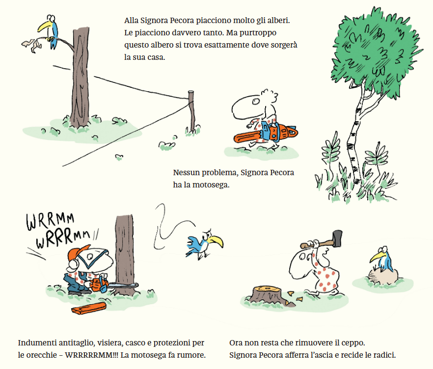 Certo, non può farlo da sola, ma per fortuna ha degli amici che la aiutano: la signora Elefante arriva con pala e trivella. Il signor Lupo trasporta sacchi di cemento, generatori e un sacco di attrezzi sul suo quad. La signora Mucca sa usare una smerigliatrice angolare e nessuno sega con la stessa precisione della signora Coccodrillo e la sua sega circolare.