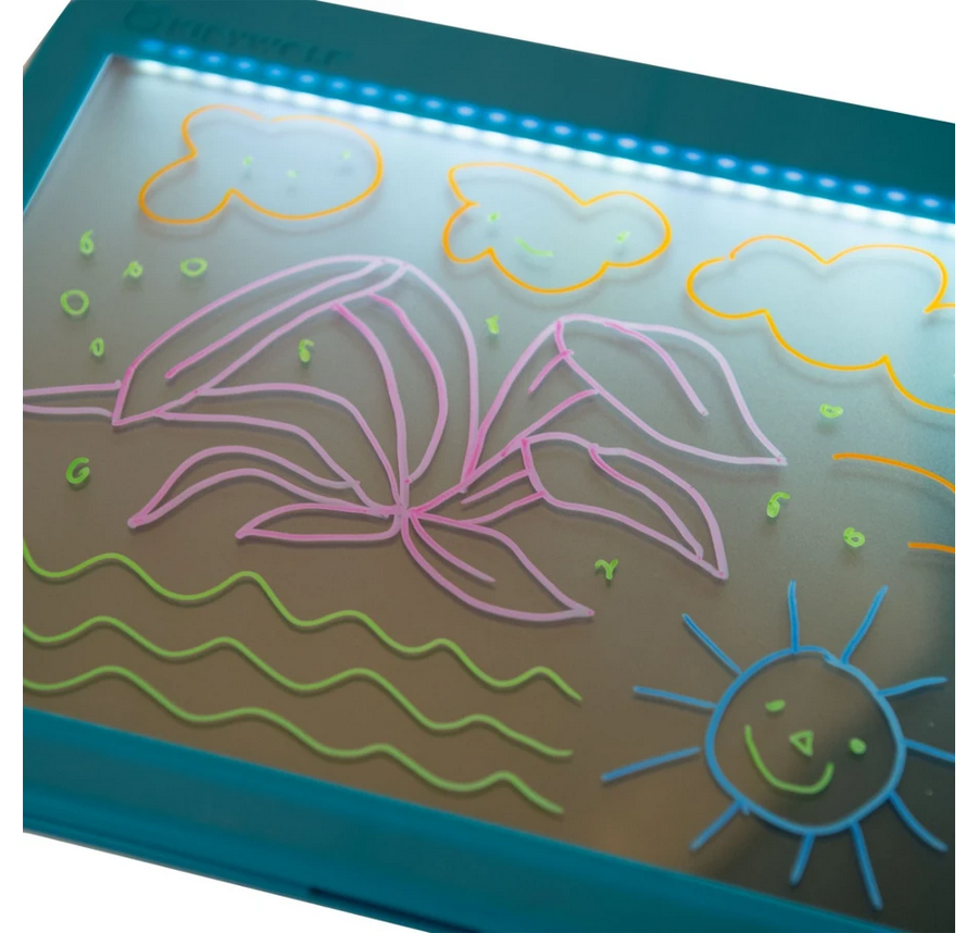 La parte posteriore della tavola funge da lavagna con un pannello LED che si illumina al buio e mette in evidenza i colori del disegno durante la notte.