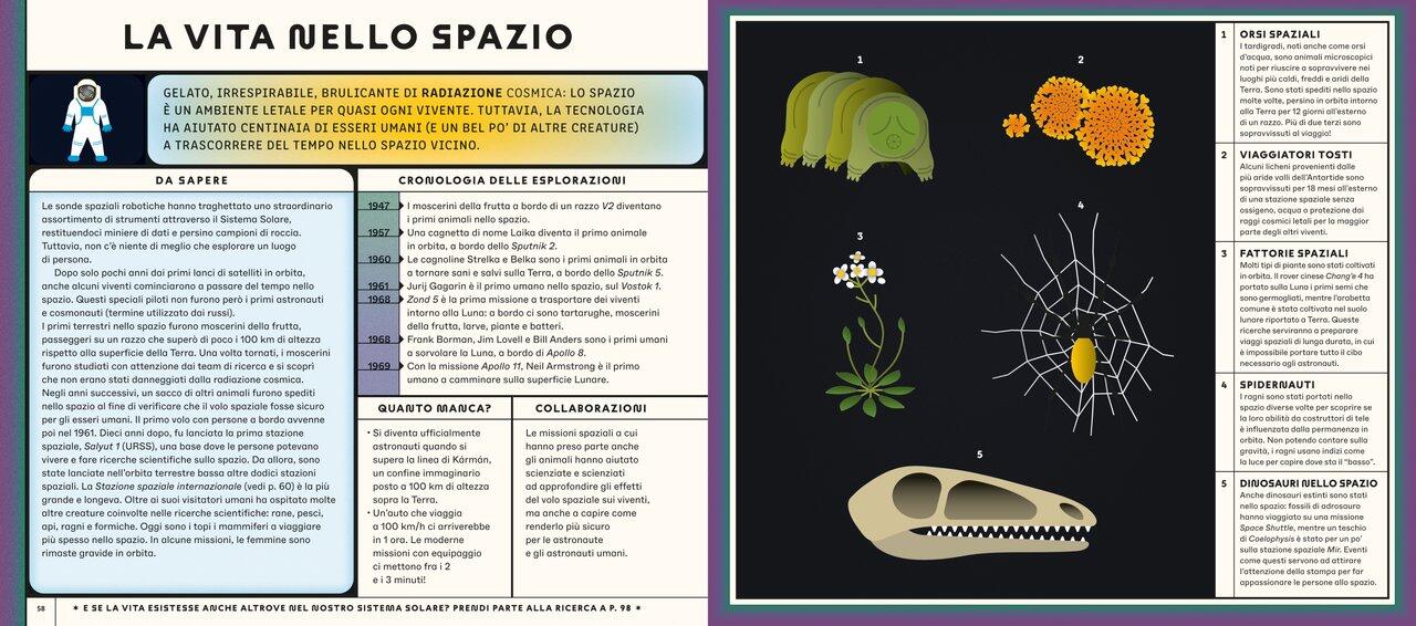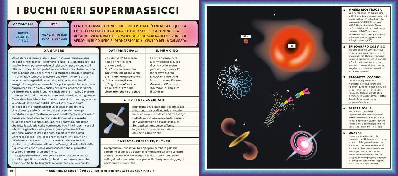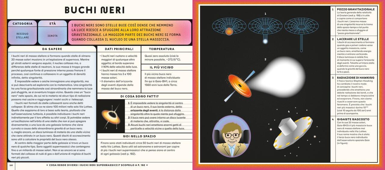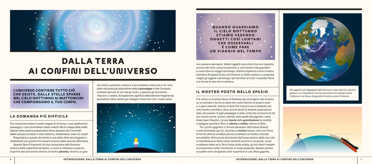 Quali misteri si celano nell’infinità del cielo notturno?Pianeti che orbitano maestosi, luminose comete, buchi neri supermassicci, stelle in esplosione, ragnatele cosmiche… Alcuni di questi fenomeni sono così remoti che guardarli da qui significa viaggiare indietro nel tempo.Dalle osservazioni degli astronomi babilonesi alle più avanzate sonde solari, dagli sbarchi sulla Luna fino alla ricerca della materia oscura, questo libro suddiviso per schede ricche di dati e descrizioni guiderà i lettori in un’esauriente esplorazione dell’Universo.Un concentrato di scienza e di originalità grafica per immergersi nello spazio più profondo e conoscere le tecnologie che ci permettono di studiarlo.