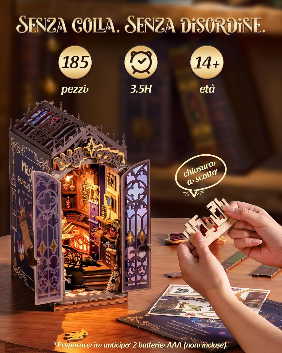 Raccontare una storia visiva è come tessere una magia. Ogni elemento ha uno scopo e ogni aspetto ha un'intenzione. La missione di Robotime è quella di consentire ai creatori di dare libero sfogo alla loro immaginazione attraverso i loro progetti, come il Magic Fantasy Corner. Ed è così che capiscono di aver raggiunto il loro obiettivo: utilizzando uno spazio minimo, il piccolo angolo lettura è in grado di ispirare infinite storie, invitando chiunque lo guardi a entrare in un mondo dove la creatività non ha limiti. Ognuno di noi ha questo potere dentro di sé, la capacità di plasmare mondi e rendere tangibili i sogni. Abbiamo solo bisogno del coraggio di provare, di mettere insieme i primi pezzi e di entrare in un ritmo in cui le nostre mani creano magia attraverso il potere dell'immaginazione. Questo è l'hobby del fai da te, ed è questo che rappresenta Robotime.