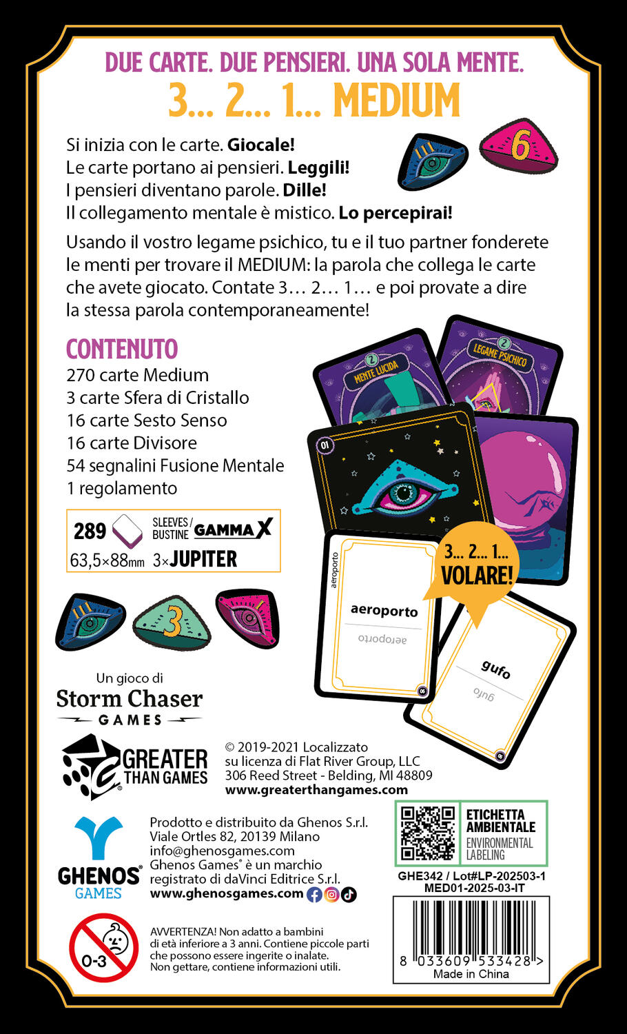 Medium è un party game da giocare in famiglia o con amici. Attingerai alle tue straordinarie capacità extrasensoriali per comunicare mentalmente con i tuoi compagni. Tu e un partner dovrete pensare assieme al Medium, la parola che collega i due termini sulle vostre carte, e dirlo ad alta voce nello stesso momento. Prima dovrai giocare con la persona alla tua sinistra e poi con quella alla tua destra. Quando viene pescata la terza e ultima carta Sfera di Cristallo, essa andrà in frantumi, interrompendo la connessione psichica fra i giocatori. La coppia con più punti vince!