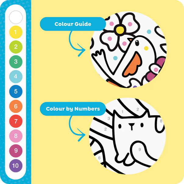 Una nuova versione di un classico del colorare e un ottimo modo per incoraggiare la creatività nei bambini che hanno bisogno di una guida. Il colorare è presentato come un gioco di scoperta che promuove ulteriormente la partecipazione. Il riconoscimento dei numeri e dei colori è supportato anche dal fatto che i bambini abbinano i numeri alla legenda dei colori. Basta colorare i numeri corrispondenti (o i punti corrispondenti) con il pennarello del colore corretto e guardare il disegno prendere vita.