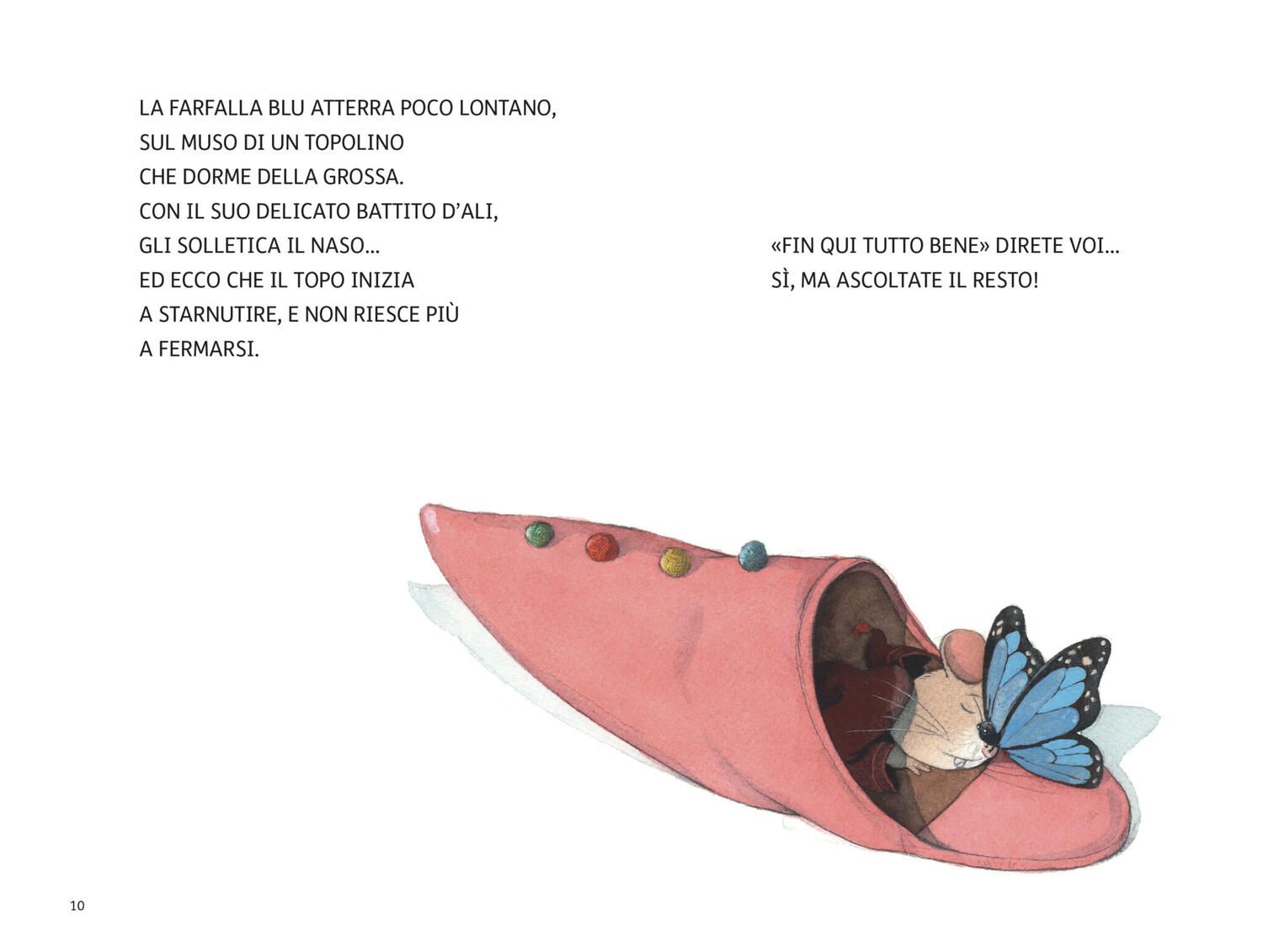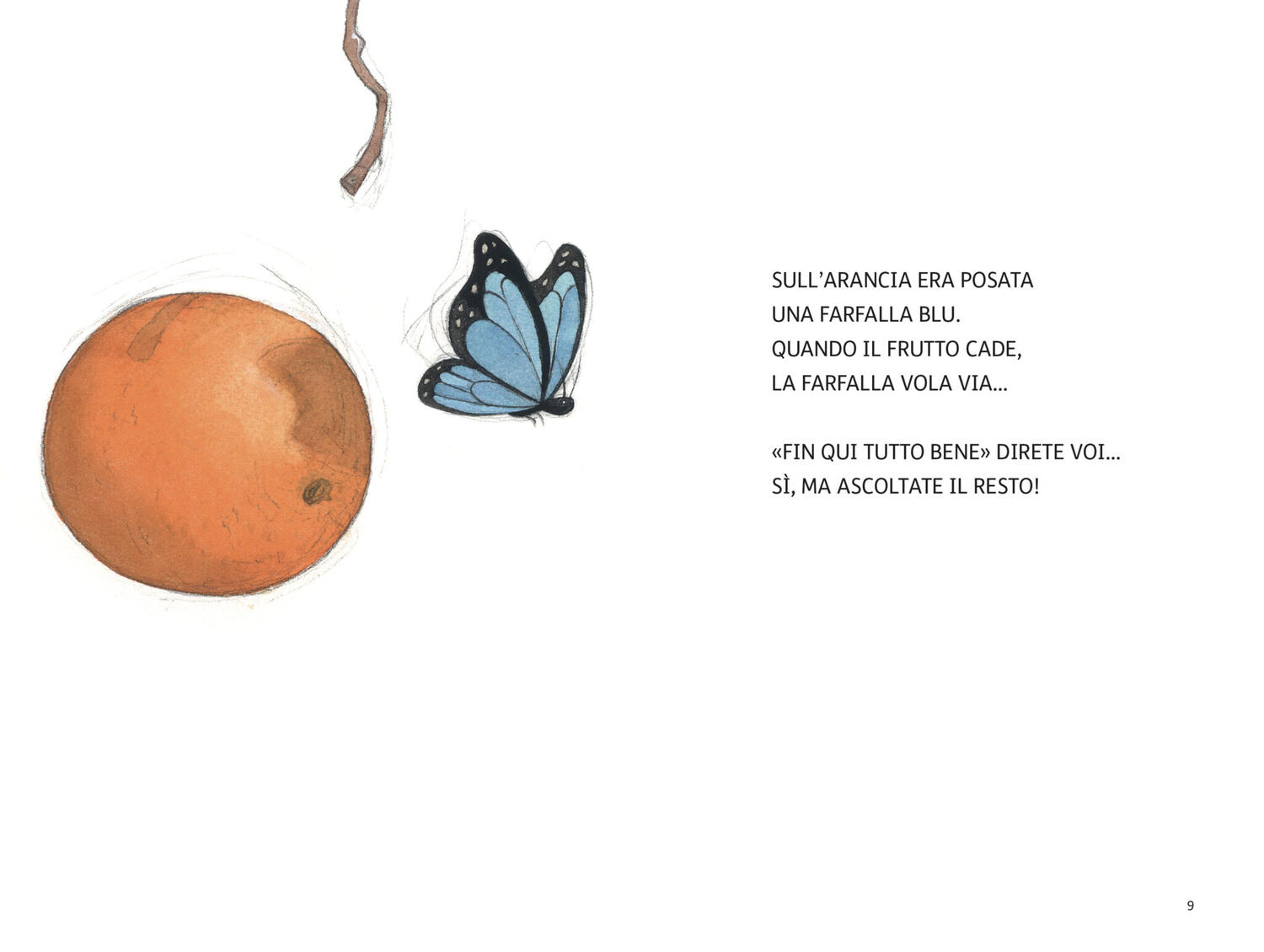 Un’arancia cade dal ramo: fin qui tutto bene, direte voi! E invece sull’arancia era posata una farfalla blu, che volando via fa il solletico sul naso di un topolino addormentato, che si sveglia e starnutisce proprio davanti a un asino… e poi? Tra catastrofi al mercato, saggi sultani e ragazzini pronti a compiere grandi imprese per amore, queste due storie ci dimostrano che anche il più piccolo evento può dar vita a buffi imprevisti e divertentissime avventure.