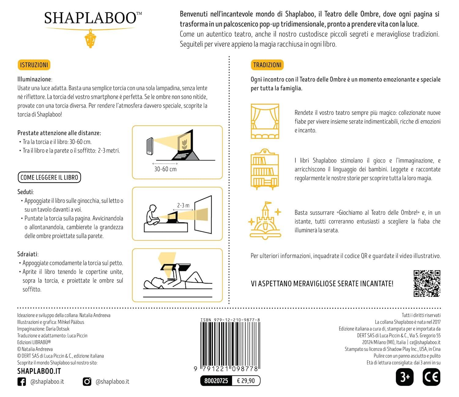 SHAPLABOO è uno spettacolo racchiuso in un libro: un Teatro delle Ombre che trasforma la lettura in un’esperienza immersiva. Con una semplice torcia, sagome e scenografie prendono vita sulla parete, creando un mondo di luce, ombre e meraviglia.