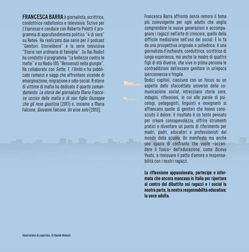 Francesca Barra affronta senza remore il tema più coinvolgente per ogni adulto che voglia comprendere le nuove generazioni e accompagnare i ragazzi nell’arte di crescere, quello della difficile mediazione nell’uso dei social. E lo fa da una prospettiva originale e poliedrica: è una giornalista d’inchiesta, conduttrice, scrittrice di lunga esperienza, ma anche la madre di quattro figli di età diverse, che vive in prima persona le contraddizioni dell’essere genitore in un’epoca iperconnessa e fragile. Dodici capitoli, ciascuno con un focus su un aspetto dello sfaccettato universo della comunicazione social, intrecciano storie vere, indagini, riflessioni, in cui alle parole di psicologi, pedagogisti, linguisti e insegnanti si affiancano quelle di genitori che hanno conosciuto il dolore. Il risultato è un testo pensato per creare consapevolezza, offrire strumenti pratici e diventare un punto di riferimento per madri, padri, educatori e professionisti del mondo della scuola. Un manifesto ma anche uno spazio di confronto che vuole “accendere il fuoco” dell’educazione, come diceva Yeats, e rinnovare il patto d’amore e responsabilità con i nostri ragazzi.