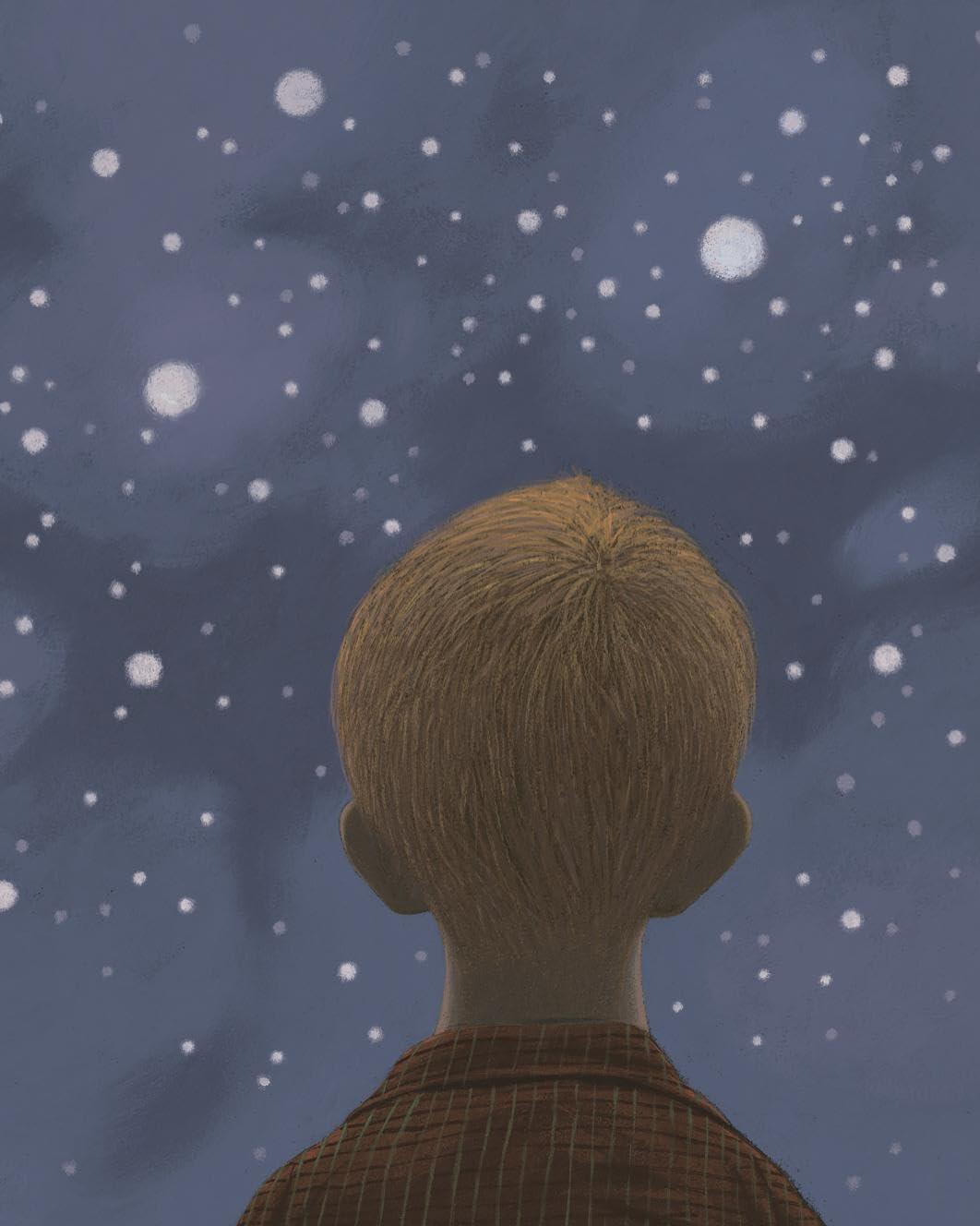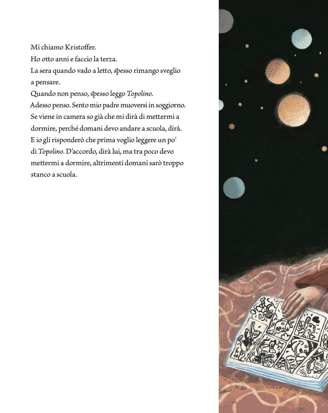 Kristoffer ha otto anni e la sera, quando va a letto, rimane sveglio a pensare all’universo. Come può essere infinito? In fondo tutto ha una fine, no? E se invece anche l’universo ha una fine, cosa c’è dopo? E se da qualche parte nell’universo ci fosse un gigante addormentato e noi fossimo solo il sogno del gigante? Kristoffer ha paura e chiama suo padre, che con un abbraccio, in un dialogo filosofico e poetico, affronta insieme a lui le grandi domande a cui non possiamo dare risposta, se non forse con l’immaginazione.