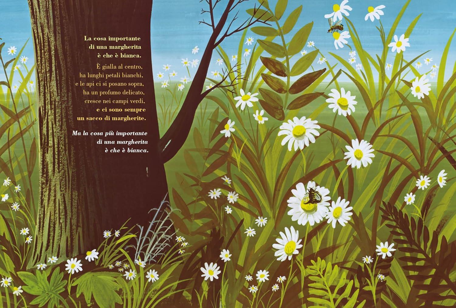 Quando si guardano intorno, di ogni cosa i bambini notano piccoli dettagli importanti. Si accorgono dei colori, osservano le forme, percepiscono i suoni. La voce di un grande ha il compito di dare all’infanzia la libertà di essere sé stessa, ma anche quello di accompagnarla nel mettere un po’ di ordine nello stupore di fronte alla scoperta del mondo. E come capita guardando attraverso un vaso pieno d’acqua, la realtà, una volta raccontata, si rivela trasparente e chiara. Il nitore e la bellezza delle illustrazioni di Leonard Weisgard e la poesia delle parole dell’insuperabile Margaret Wise Brown non invecchiano mai perché hanno il merito di descrivere il mondo così com’è.