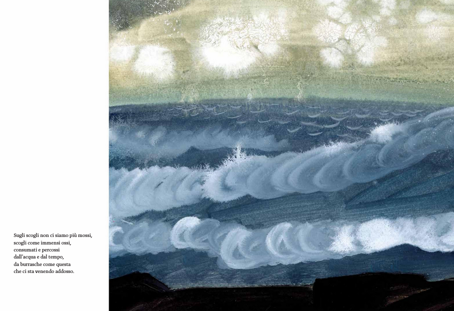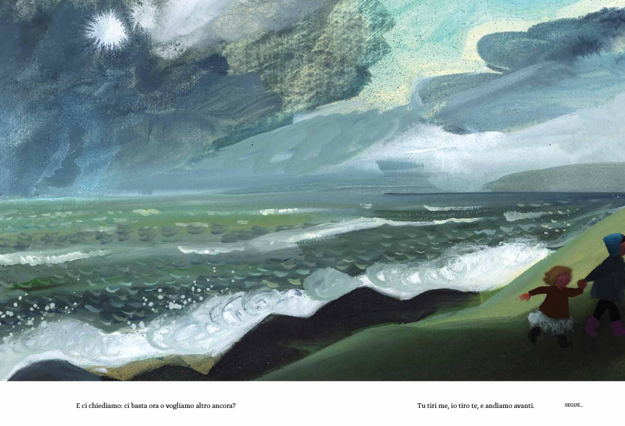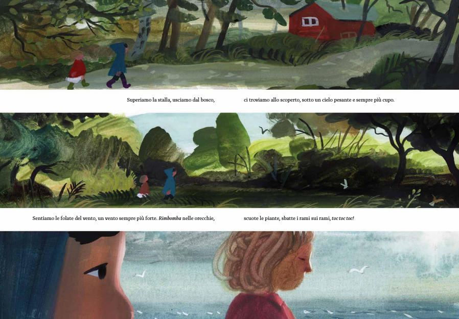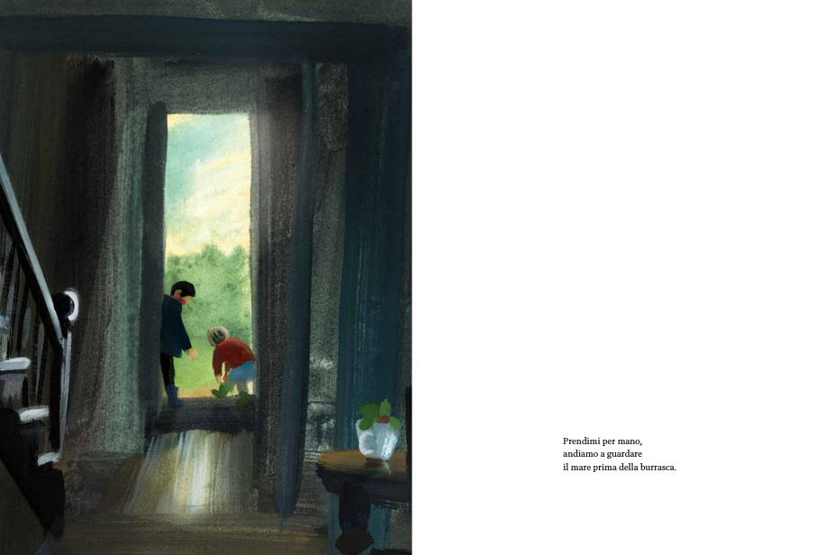 Messi gli stivali da pioggia sulla porta di casa, fratello e sorella escono per andare a vedere il mare in burrasca. La strada sterrata che scricchiola, poi il bosco da attraversare che cigola e poi il cielo sempre più cupo. Ma loro vanno avanti anche se il vento è teso e arriva la pioggia. Al primo tuono, comincia la corsa e un po’ di paura, ma il tenersi per mano è una sicurezza… Domani il cielo sarà di nuovo sereno.